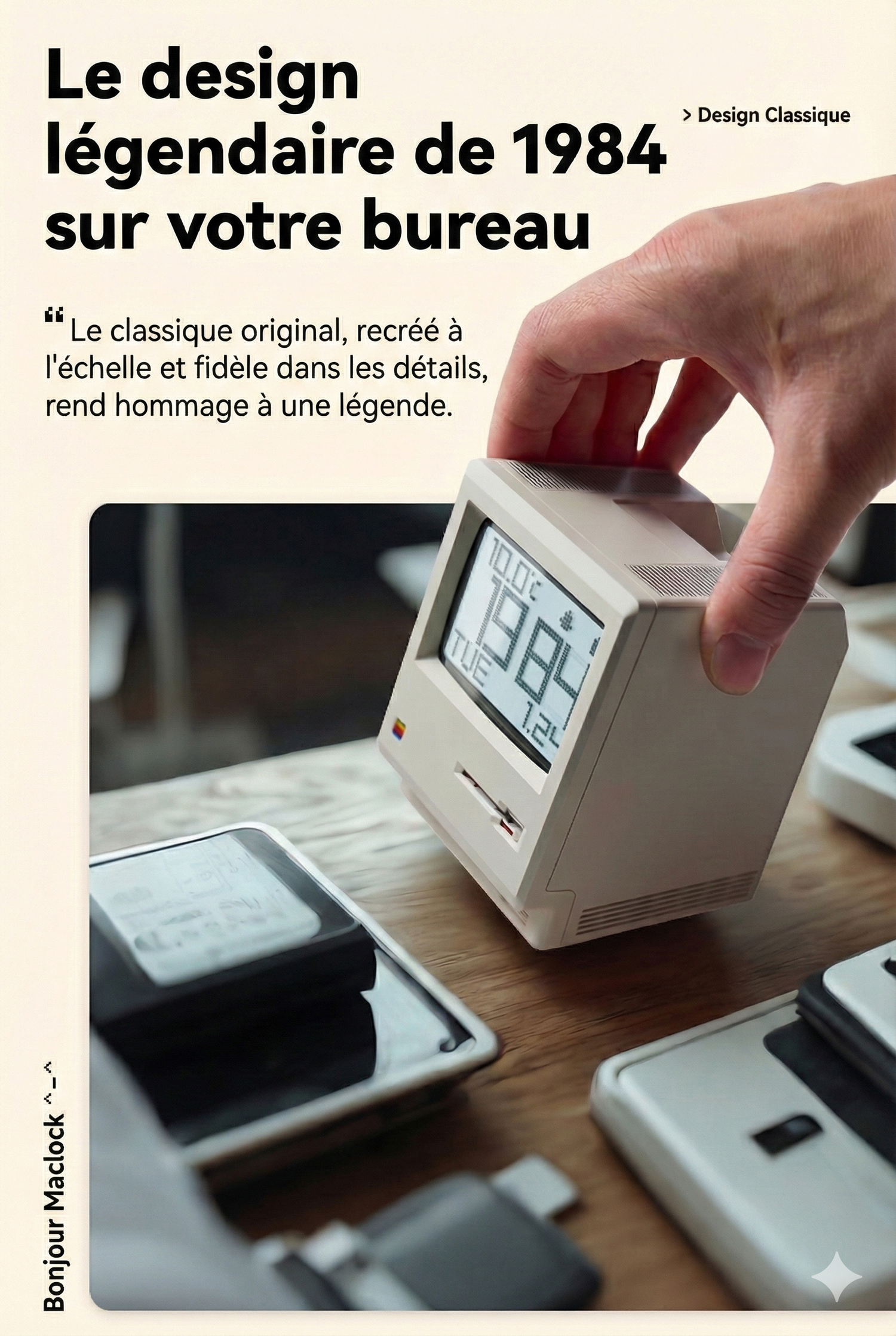 Tout est parti d'un constat simple : nos bureaux modernes sont devenus tristes, peuplés d'écrans noirs et froids. Nous avons voulu briser cette monotonie en ressuscitant le design le plus chaleureux de l'histoire. Le MacLock n'est pas né d'une étude de marché, mais d'une envie personnelle : celle de mélanger l'esthétique intemporelle de 1984 avec l'utilité dont nous avons besoin aujourd'hui.